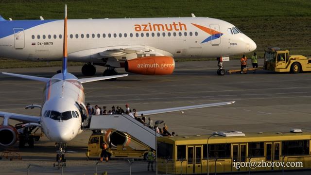 2 августа 2022 года, аэропорт Адлер (AER/URSS), Сочи, Россия. Буксировка самолёта Суперджет 100-95B RA-89179 авиакомпании “Азимут” к месту запуска двигателей, TWY C. Самолёту 6 с половиной лет, первый полёт 6 февраля 2019 года. В составе флота авиакомпании “Азимут” с 8 июня 2021 года. Носит имя реки Тобол. Компоновка салона - 100 мест эконом-класса. * Tractor pushing airplane Sukhoi Superjet 100 of AzimuthAirlines SOCHI, RUSSIA - AUGUST 02, 2022: Aircraft Sukhoi Superjet 100, RA-89179 of Azimuth towing, side view. Tractor pushing plane. Passengers board the plane. #Superjet,#SukhoiSSJ,#Azimuth,#Tobol,#Sochi #Adler,#AvGeek,#AviationLovers,#Азимут,#Сочи