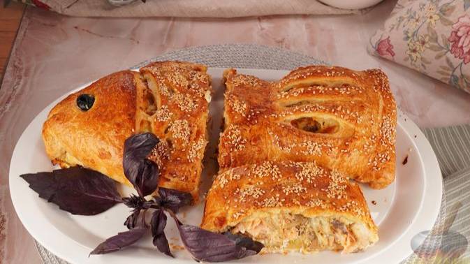 Пирог выпекается из готового слоёного теста. Внутри – выложенная слоями начинка из сыра, красной рыбы и грибов с луком и сливками. Начинка интересно дополняется пряностями и приправами: в одном месте – сушёными томатами с базиликом, в другом – горчицей и майонезом. Результат ошеломляющий! #Рыбник #ИзГотовогоТеста #НесладкаяВыпечка #СлоёноДрожжевойРыбник