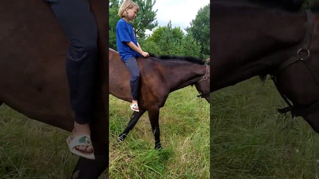 Лошадь у нас впервые на пастбище. Привыкаем к лошади.