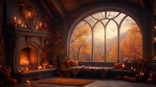 Cozy Fall Ambience 🍁 _ Autumn Foliage with Relaxing Fantasy Music and Crackling Fire