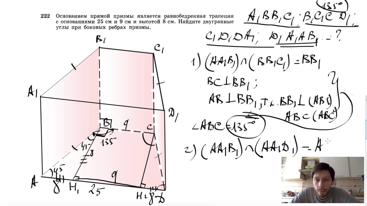 №222. Основанием прямой призмы является равнобедренная трапеция с основаниями 25 см и 9 см и высотой 8 см. Найдите двугранные углы при боковых ребрах призмы. Поддержать канал рублём - 5469400944002125 (Сбербанк) Мой второй канал для подготовки к ЕГЭ и ОГЭ - https://www.youtube.com/ЕвгенийСумин Инстаграм - https://www.instagram.com/EGE_OGE.math Личный инстаграм - https://www.instagram.com/ee_sumin VK - https://vk.com/evgeniysumin FB - https://www.facebook.com/EvgeniySumin