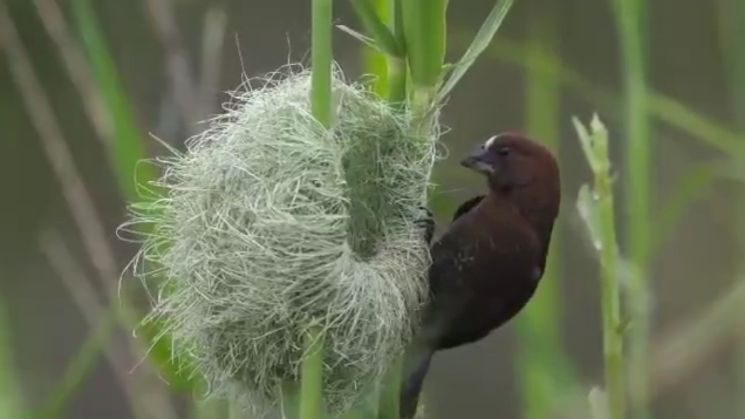Толстоклювый ткач усердно строит гнездо, стараясь всеми силами произвести впечатление на самку