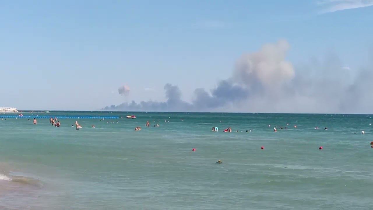С пляжа видны последствия хлопков. 15.20 9 августа 2022. Пляж Лазурный Берег. Крым Евпатория.