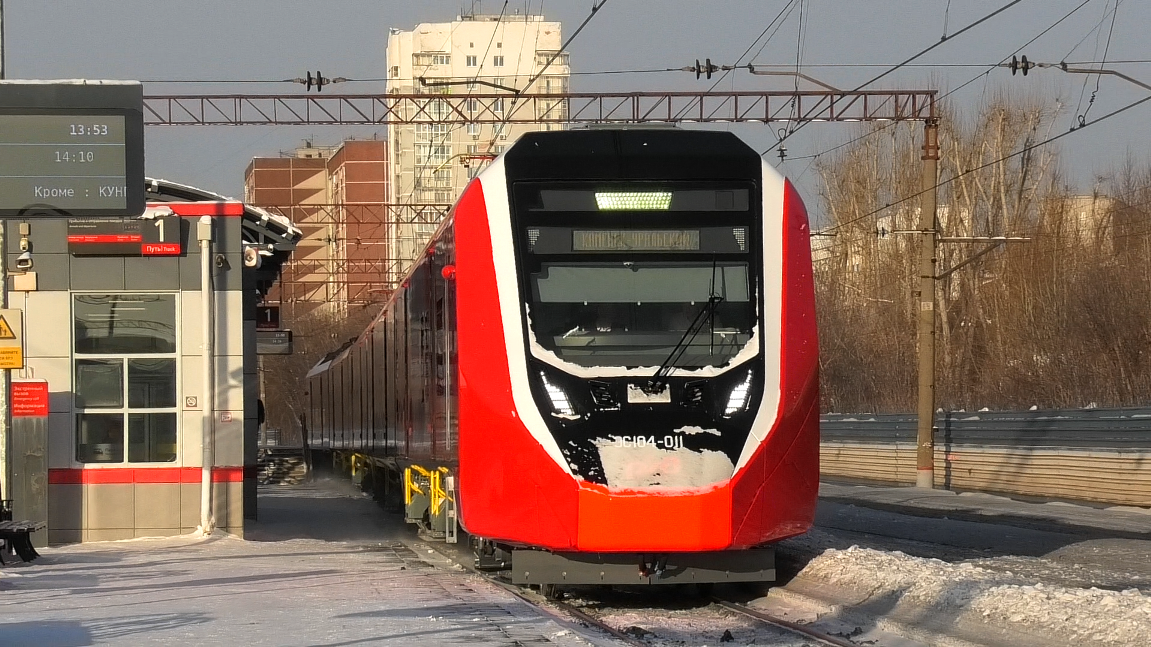 Электропоезд ЭС104-011 "Финист" сообщением №7084 Екатеринбург-Пасс. - Каменск-Уральский следует по перегону Екатеринбург-Пасс. - Шарташ с остановкой на о.п. Первомайская. Свердловская ЖД. Город Екатеринбург, Россия. Приписка: ТЧПРИГ-21 Свердловск. 14.01.2024