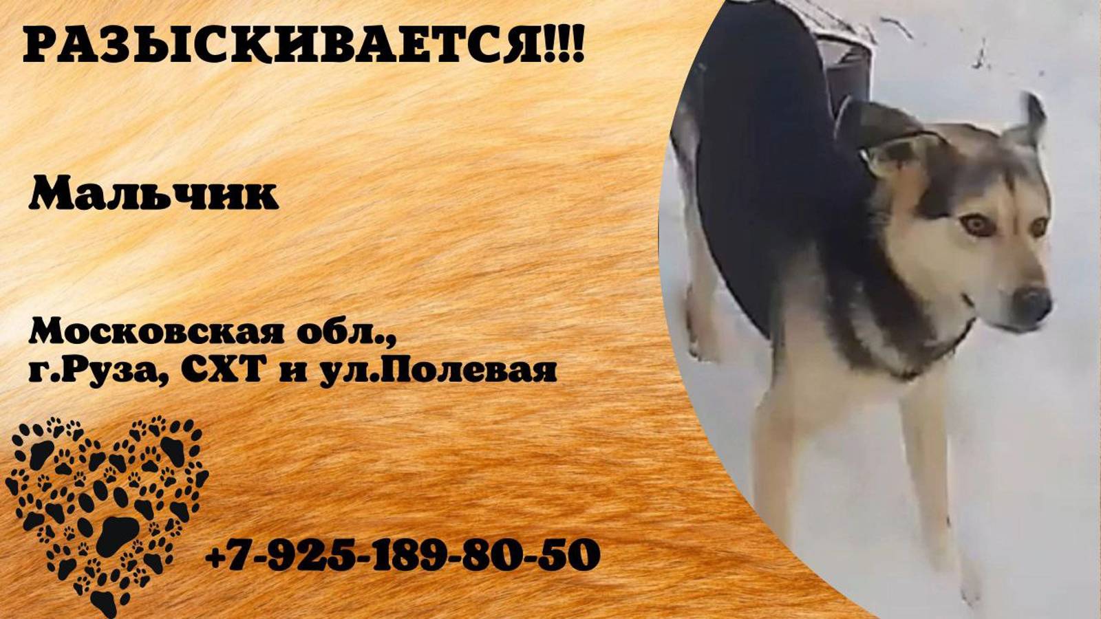 Московская Руза Пропала собака Пропала собака, молодой кобель с ошейником и карабином,, не агрессивный,видели в районе СХТ и ул.Полевая, буду благодарна любой информации,тел.89251898050. Инфо: https://vk.com/wall-198815410_153947 Автор: https://vk.com/id166228475
