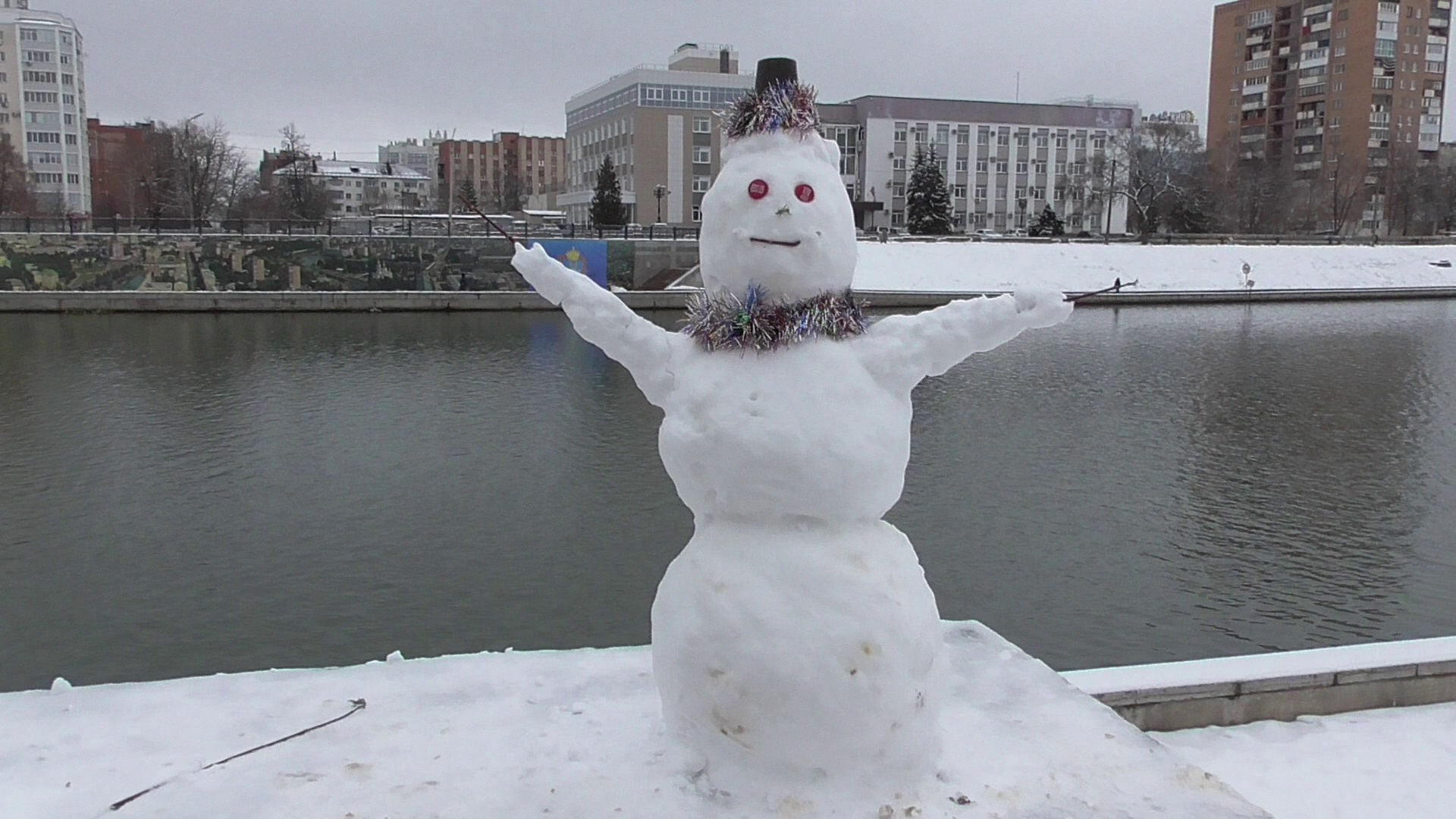Снеговик на набережной. Набережная и река