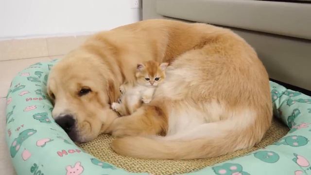 Котёнок уснул на лежанке ретривера