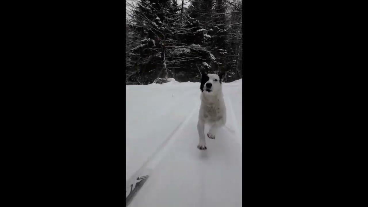 Вид с сзади когда я спускаюсь на лыжах в лесу