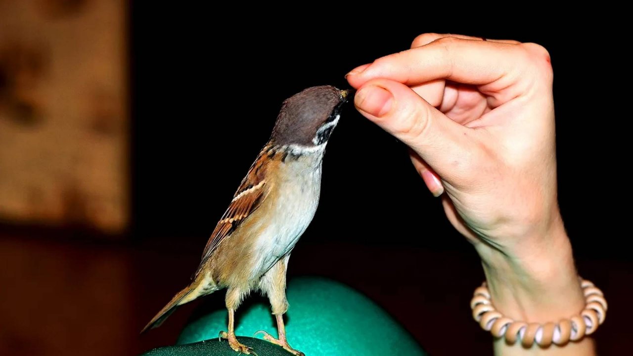 Игривый ручной воробей Джек