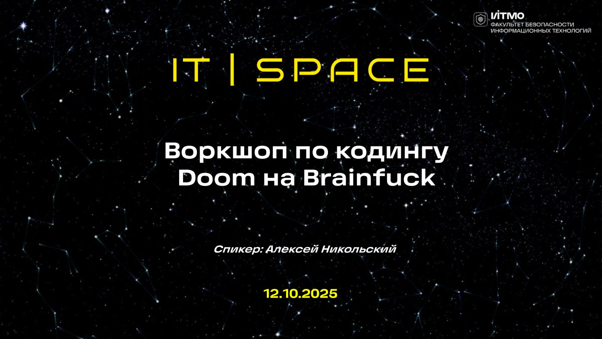 Дата: 12.10.25 Воркшоп, на котором буквально пишут DOOM на Brainfuck. Запуск проекта, обсуждение первых коммитов, идей и написание кода в лайве! 🔥 DOOM - культовая видеоигра, с которой для многих началась эпоха 3D-шутеров и экспериментов с «железом» 🧠 Brainfuck - минималистичный язык программирования, где восемь команд, ноль жалости и максимум изобретательности Спикер: Алексей Никольский, эксперт в области операционных систем и обратной разработке, преподаватель факульета безопасности информационных технологий ИТМО, вещудий Мастерской системного программирования ИТМО (https://t.me/itmosysint) Ссылки: Репозиторий проекта DoomBF на GitHub https://github.com/sit-itmo/DoomBF Мастерская системного программирования ИТМО https://t.me/itmosysint Уровень сложности материала: 🔑x4 — для изучения материала слушателям рекомендуется иметь базовые навыки в IT и разработке