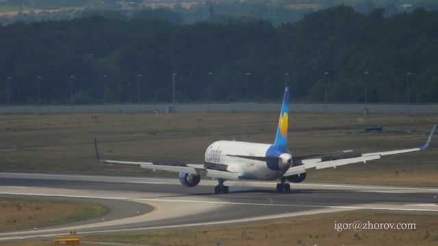 19 июля 2017 года, аэропорт Франкфурта-на-Майне (FRA/EDDF), Германия. Boeing 767-330ER(WL) D-ABUC авиакомпании Condor приземляется на ВПП 25R. Самолёту более 31 года, первый полёт 11 декабря 1992 года. Первый эксплуатант - чартерная авиакомпания Condor. За тридцать лет борт успел сменить несколько ливрей - Lufthansa, Thomas Cook, Condor (в том числе ранний вариант с желтым килем). Конфигурация салона - 18 мест бизнес-класса, 39 мест эконом-комфорт, 202 места эконом-класса. Во время пандемии (с апреля 2020 по февраль 2021 года) салон был трнсформирован в грузопассажирский вариант (Preighter) - для пассажиров было оставлено 18 мест бизнес-класса и 8 мест (1 ряд) мест эконом-класса, остальное пространство салона занимал грузовой отсек без кресел. * Boeing 767 of Condor landing, touching FRANKFURT AM MAIN, GERMANY - JULY 19, 2017: Airplane of Condor landing, touchdown and braking at Frankfurt Airport. Side view of passenger jet arrival. Tourism and travel concept #Condor,#Fraport,#Frankfurt,#FRA,#EDDF #Франкфурт,#споттинг,#Боинг767,#приземление,#касание