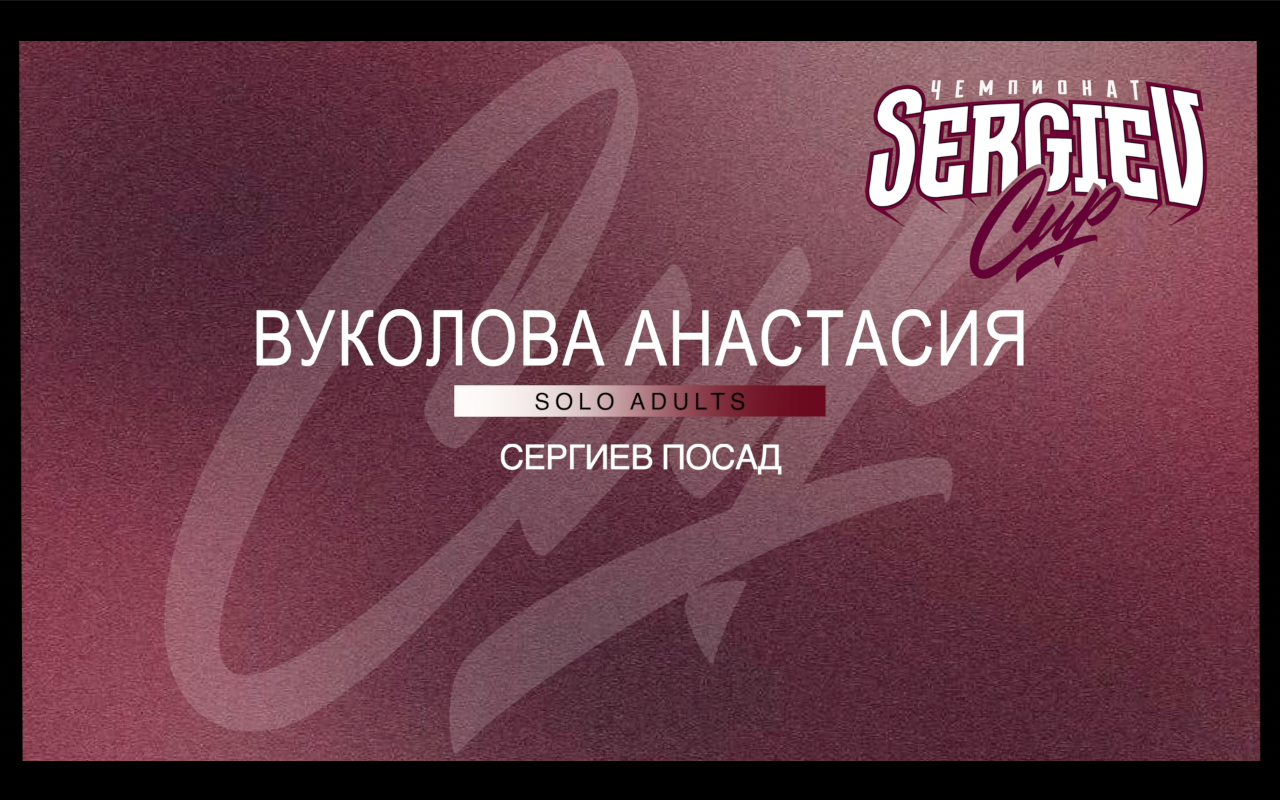 SERGIEV CUP 2024 Вуколова Анастасия Номинация: Solo Категория: Adults Жюри чемпионата: Тоха Андреев Артем Соляник Артем Нефедов ОРГАНИЗАТОР МЕРОПРИЯТИЯ: TRIASH PRODUCTION Информация о предстоящих чемпионатах: Telegram : https://t.me/triash_prod ВК : https://vk.com/sergiev_cup YOUTUBE : https://www.youtube.com/channel/UCPDX3Znh7OJQqmb0v5u1MHw Дополнительная информация : +7 (916) 533-50-63