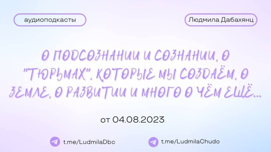 Аудиоподкаст от 04.08.23 На тему «О подсознании и сознании, о тюрьмах, которые мы создаём, о земле, о развитии и много о чем еще…» ТЫ МОЖЕШЬ ПРИЙТИ СО СВОИМ ЗАПРОСОМ! ✓ Обязательно поставь лайк ✓ Подпишись на канал ✓ И поделись с близкими Это будет вашим балансом за движение и получение энергии. Если есть желание создать баланс брать-давать... приму от всего сердца с благословением (донейшн). С Огромной Любовью, Дабахянц Людмила ✨ Telegram: https://t.me/ludmiladbc ✨ Канал в telegram “Я ЕСТЬ ТО, ЧТО Я ЕСТЬ”: https://t.me/LudmilaChudo ✨Онлайн-школа: https://ludmilachudo.skillspace.ru/school