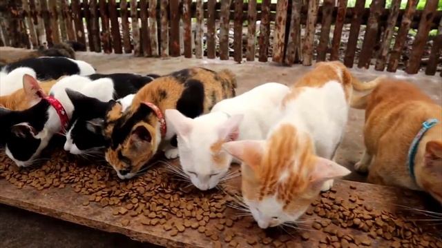 Время голодных кошек кормление кошек сухим кормом для голодных кошек котёнок ест сухой корм
