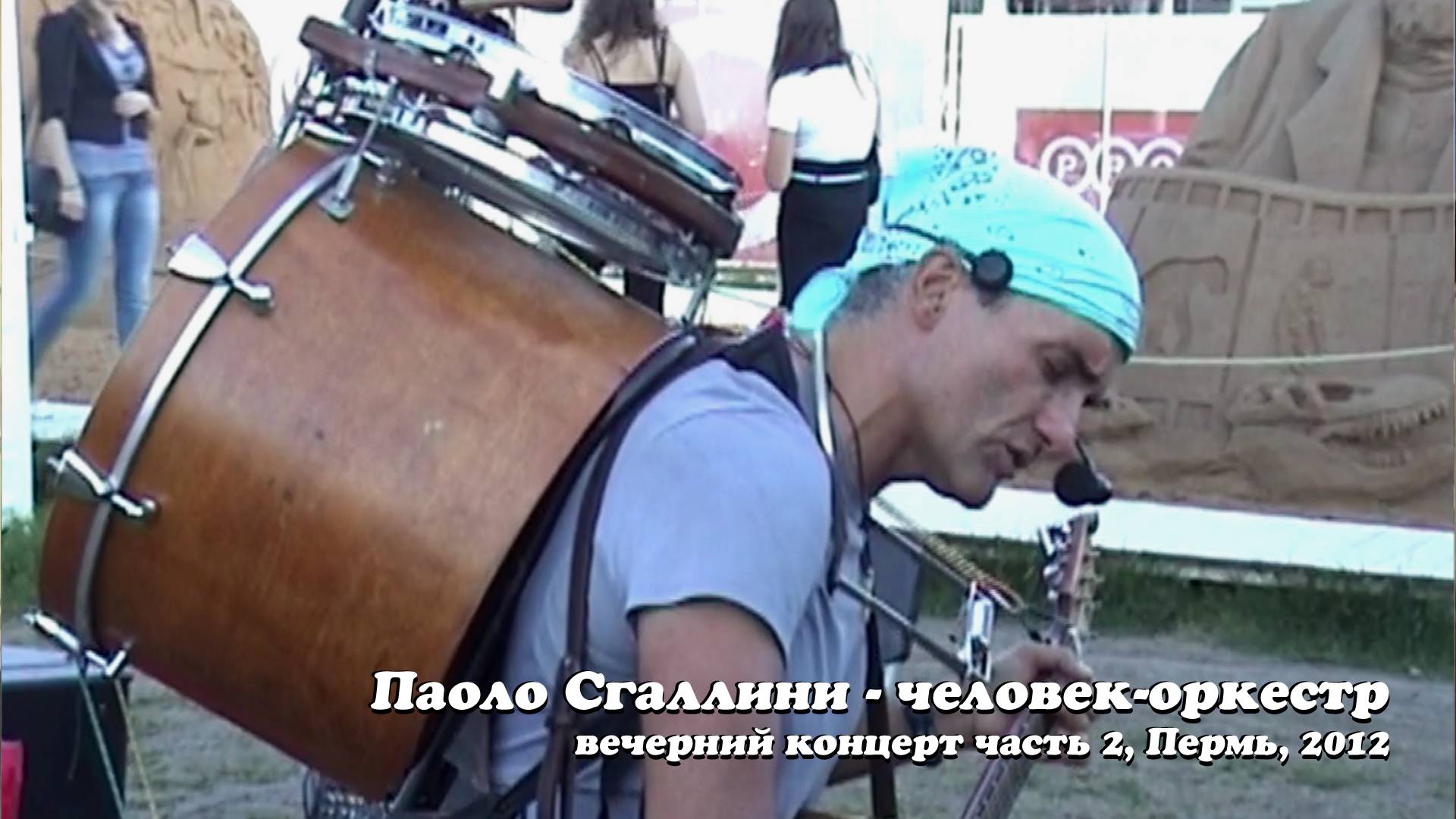 ПАОЛО СГАЛЛИНИ, человек-оркестр (Пермь 2012г.). Вечерний концерт, часть 2 / 5. Еще раз представляю вам моего лучшего итальянского друга Паоло Сгаллини. Он профессиональный музыкант из Римини, играет на гитаре, укулеле, ударных инструментах, гармонике, казу. В его репертуаре песни известных исполнителей: Битлз, Пинк Флойд, Боб Дилан, Карл Перкинс, Брюс Спрингстин, Джон Денвер, Джонни Кэш и многих других. В июле 2012г. Паоло был приглашен на фестиваль Белые ночи в Пермь. Я с моим другом Ильей Васильевым (он тоже профессиональный музыкант, композитор, поэт и участник дуэта Пигмалион) специально приехали в Пермь для встречи с Паоло. Мне удалось снять на видео два концерта Паоло: утренний (который я разделил на 4 части) и вечерний (разделен мною на 5 частей). В вечернем концерте интересно наблюдать, как к Паоло присоединяются два молодых пермских музыканта. Сначала очень удачно подключился молодой парень с барабаном Тарабука (у Паоло к этому моменту начались неполадки с его ударной установкой). А затем к ним примкнул молодой гитарист. Так случайно и быстро, без всяких предварительных репетиций, сформировалось интересное трио. Это был настоящий живой концерт со своими плюсами и минусами: импровизации, шутки Паоло, уточнение тональностей песен, шумы зрителей, других артистов и участников фестиваля, пролетающих над городом истребителей, сбои с аппаратурой (Паоло периодически вызывал звукооператора Алекса для корректировки уровней громкости инструментов и голоса). Надеюсь, просмотр будет интересным для вас! PAOLO SGALLINI - One Man Band from Rimini (Italy) in Perm (Russia 2012). Evening Concert part 2 / 5. And once again I am pleased to introduce you to my best Italian friend Paolo Sgallini. He is a professional street performer from Rimini (Italy). He calls himself the "One-Man-Orchestra". He plays guitar, percussion, harmonica, kazoo, ukulele. His repertoire is very wide: from rock'n'roll and blues to reggae, country, jazz and pop. He performs and sings songs by the Beatles, Pink Floyd, Carl Perkins, Bob Dylan, Bruce Springsteen, John Denver, Johnny Cash and many others, including songs by Italian composers. In July 2012 Paolo visited Perm (Russia). He was invited to the White Night festival. Me and my friend Ilya Vasiliev (also a professional musician, composer and the author of songs, the member of the Duo Pygmalion) specially came to Perm to meet with Paolo. On this day we saw two Paolo' concerts (morning and evening ones), which I luckily captured on video camera. Here you can watch the 2nd part of the evening concert. I divide this concert into 5 chapters. At the evening concert, you will see that Paolo was joined by young Permians musicians. First, an young man with a Tarabuka drum, and then another guy with an electric guitar. This was a real suddenly created group without any prior preparation or rehearsals! These were real live concerts with their pros and cons (improvisations, crowd noise, noise of engines, some hardware problems, etc.). All live, all natural and atmospheric! I really hope you will find this interesting for you! Enjoy!