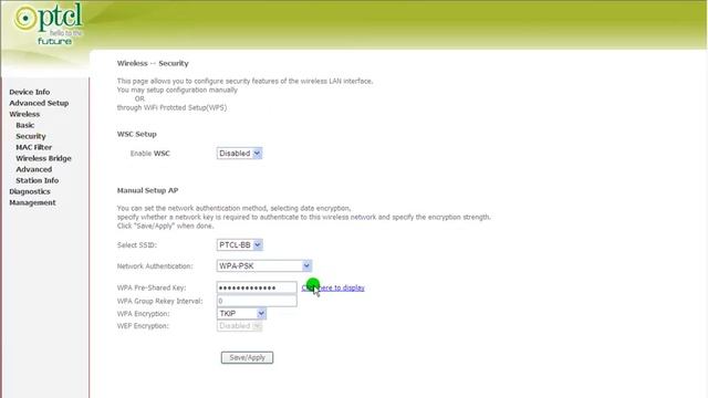 This video shows how to know and change your Ptcl wireless security password. You can set a password on your wireless broadband to prevent it from using by other people through their devices. URL:192.168.1.1 Username:admin Password:admin