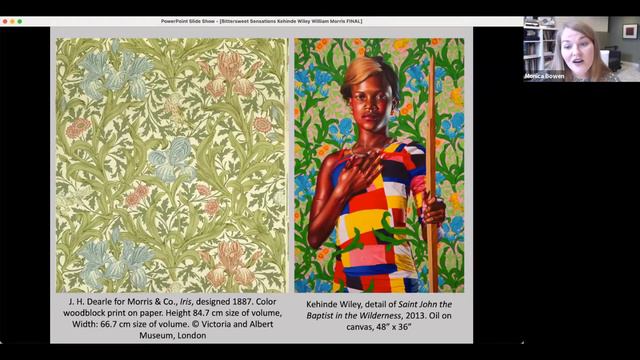 Monica Bowen (Seattle University) presents her paper "The Bittersweet Sensations of William Morris and Kehinde Wiley," exploring the use of Morris & Co. designs which feature as the backgrounds of portraits made by contemporary painter Kehinde Wiley. A question and answer session follows. Originally presented on Zoom for William Morris Society US members and registered guests on April 28, 2021. Please note the video has closed captions. Currently, the introduction and Monica's talk have been fully corrected, but the Q&A session has auto-generated captions which will be revised at a later date.