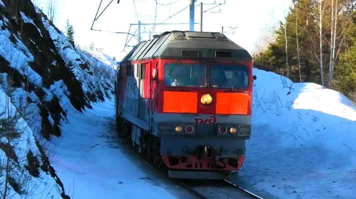 Тепловоз ТЭП70-0218 с туристическим поездом №7090/7089 "Императорский маршрут" Екатеринбург-Пасс. — Алапаевск следует по перегону Разъезд Зыряновский - Алапаевск. Свердловская ЖД. Свердловская область, Россия. Приписка: ТЧЭ-13 Егоршино. 12.03.2023