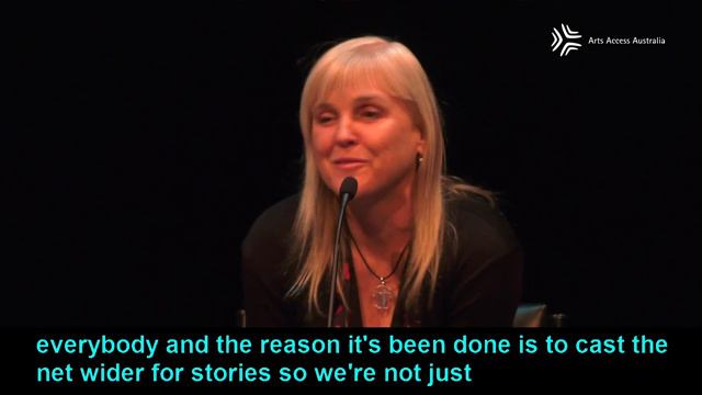 See where the disability and screen sectors meet through the Film Futures panel at Meeting Place 2018 in Alice Springs, featuring Lee Witzcak, Courtney Gibson, David Doyle and Lisa Duff. Facilitated by Fiona Tuomy. Meeting Place is Australia's leading forum on arts, culture and disability. Meeting Place 2019 will be held in Canberra, from 1 to 3 December. Find out more at www.meetingplaceforum.org. Audio description: The video shows a large black stage with several empty chairs. There is a large screen overhead with audio captions. A woman stands at a lectern on stage and speaks. On the right of the stage an AUSLAN interpreter signs. The camera zooms in on the woman. She is tall, in her 50s, and has shoulder length brown hair, glasses, and wears a red and black dress. She exits the stage as five people walk on to the stage and take a seat. From left is Fiona Tumoy, panel facilitator. She wears a black top and grey skirt with black tights. She has brown hair pulled back and wears glasses. Next to her is Lee Witzcak, who is in her 50s and wears a bright red top and has short light hair. In the middle is Courtney Gibson, who is in her 40s and wears a grey/green print top and black pants and long dark hair and glasses. Next to her is Lisa Duff, who is in her 30s and wears a red and black dress with a black cardigan. She has long blonde hair. The final panelist is David Doyle, who is a tall man with short grey hair. He wears a long sleeved blue top and jeans.