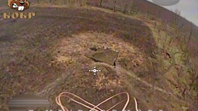 Уничтожение FPV-дроном отряда БОБР замаскированного украинского миномёта вместе с боекомплектом.