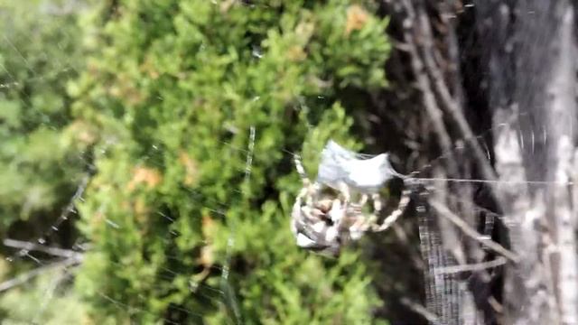 Все видели зелёного, блестящего жука-бронзовку ("июньский" жук)? Представляете его размеры? А теперь оцените размеры этого гиганта-крестовика! Он реально огромен - около 3-4 см в диаметре. Кинули у нему в паутину пойманного жука и реакция была просто мгновенной — укол нервно-паралитического яда, чтобы жук перестал двигаться, впрыск желудочного сока и консервация в паутину. Через день жука можно будет выпить через трубочку, как белковый коктейль.