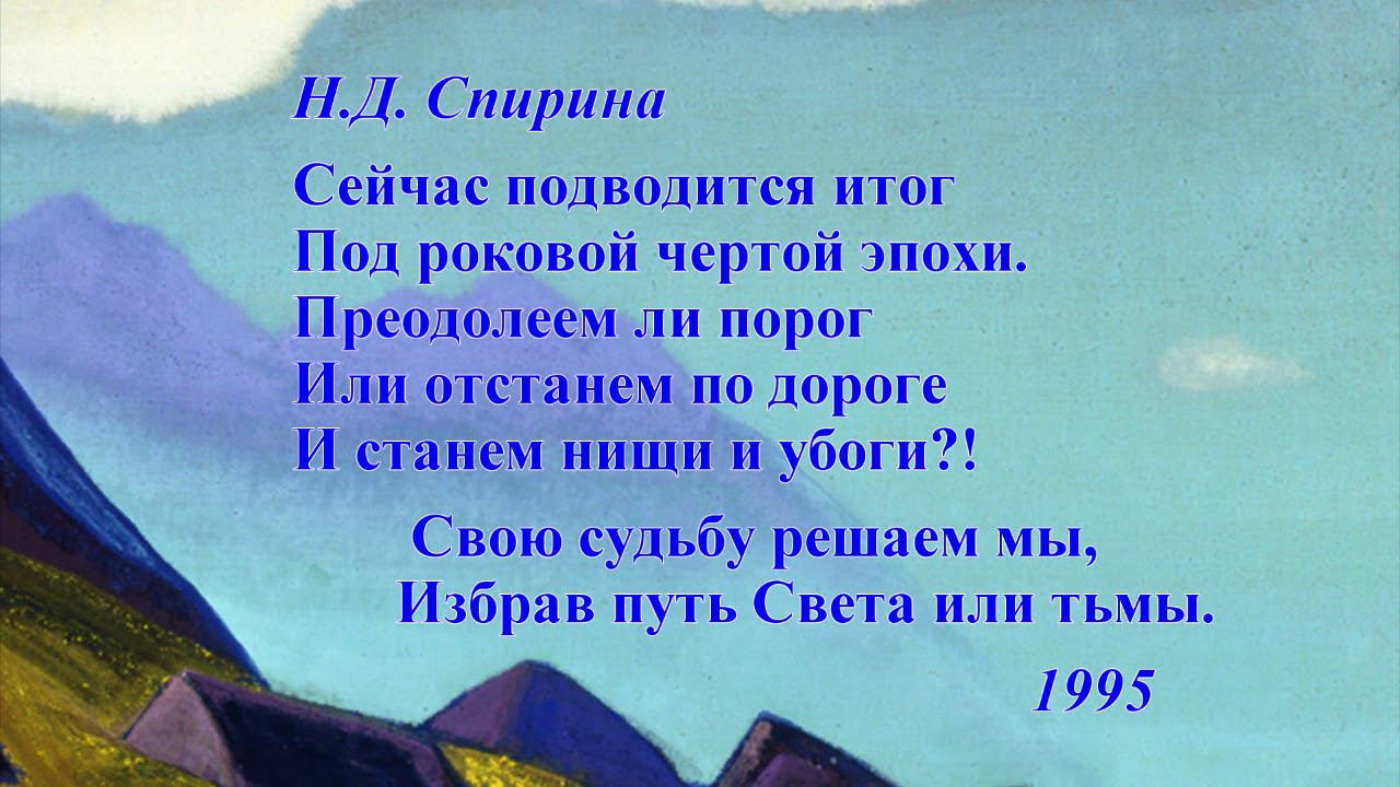 Наталия Спирина * * * Сейчас подводится итог Под роковой чертой эпохи. Преодолеем ли порог Или отстанем по дороге И станем нищи и убоги?! Свою судьбу решаем мы, Избрав путь Света или тьмы. 1995 г. Читает автор. #НаталияСпирина, #поэзияновойэпохи, #ПоэзияСпириной -------------------------------------------- О Наталии Дмитриевне Спириной: * Сайт, посвященный Н.Д. Спириной: https://spirina.info * Раздел на сайте СибРО: http://sibro.ru/teacher/spirina/ * Читать стихи: https://sibro.ru/poetry/ * Плейлист "Наталия Спирина. Стихи": https://www.youtube.com/playlist?list=PLRDwJtqWLAx6FDWLWUSyVeqmBAs0Cfx7c * Видеофильмы о Н.Д. Спириной: https://www.youtube.com/playlist?list=PLRDwJtqWLAx7zdjQRW1u5QSUW3T6SJ4rj * Вконтакте: https://vk.com/natalia.spirina * Telegram: https://t.me/SpirinaN • Рериховская поэзия: https://www.youtube.com/playlist?list=PLRDwJtqWLAx6Q4cJ_smGoz7zmaKXZee-N • Рериховская поэзия на сайте СибРО: http://sibro.ru/poetry/ -------------------------------------------- Помочь проектам СибРО: https://sibro.ru/dari-dobro/ Благодарим всех наших помощников и приглашаем к сотрудничеству! -------------------------------------------- /// Ссылки на ресурсы СибРО: Канал Сибирского Рериховского Общества и Музея Николая Рериха в Новосибирске https://www.youtube.com/c/videosibro Канал «Трансляции СибРО» https://www.youtube.com/c/telesibro ВКонтакте: «СибРО. Трансляции»: https://vk.com/telesibro Сайт СибРО: https://sibro.ru Сайт наследия Н.Д.Спириной: https://spirina.info Вконтакте: https://vk.com/roerichmuseumnsk Однокласники: https://ok.ru/roerichmuseum Telegram: https://t.me/RoerichN Дзен: https://dzen.ru/roerichmuseum Rutube: https://rutube.ru/channel/24606905/ Интернет-магазин "Искры Света": https://knigisibro.ru или на Ozon: https://www.ozon.ru/publisher/rossaziya-5101720/ Книги издательства СибРО "РОССАЗИЯ": https://rossasia.sibro.ru/knigi/