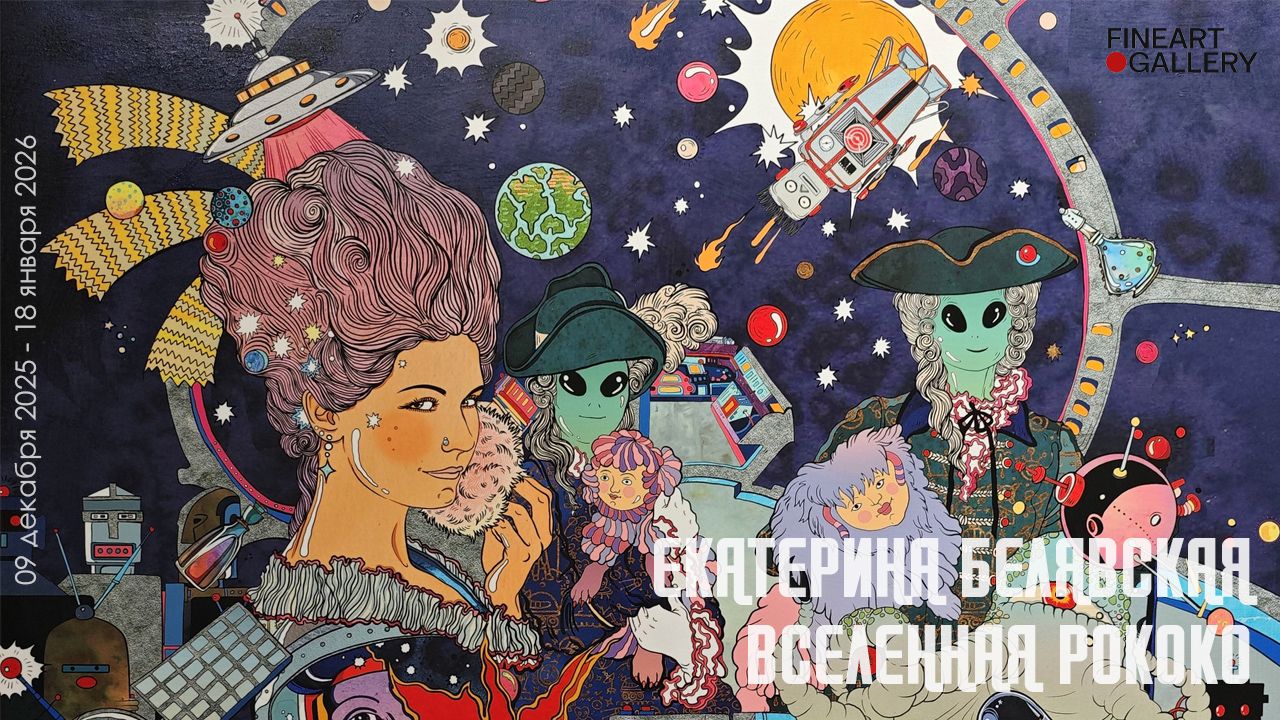 Екатерина Белявская. Вселенная рококо. FINEART GALLERY 09 декабря 2025 - 18 января 2026 Екатерина Белявская — художник, иллюстратор и дизайнер — в очередной раз не устает удивлять своей фантазией и креативностью. Её усилия на «ниве прекрасного» в этот раз привели к созданию художественной выставки, состоящей из работ, посвящённых тонкой связи между стилем рококо и космосом. «Я представляю серию картин, посвящённых приключениям Марии-Антуанетты. Она известна практически всем. Именно поэтому её образ в моих работах переносит моду XVIII века в космический мир будущего и заново создаёт вселенную рококо — виртуально, понарошку, так сказать. На самом деле эти мои произведения — попытка смешать два абсолютно непохожих мира: нежный, сверхнасыщенный и манерный мир рококо — абсолютный мир женщины, неспособной к жизни в жестоких реалиях (в те далекие времена «ого-го были женщины»), — и брутальный, абсолютно мужской мир классических комиксов о космических приключениях 60–70-х годов XX века. В результате получились весёлые, немного сумасшедшие картины об изысканном космосе и вариации на тему модных гравюр XVIII века для всех рас и видов». 4-й Сыромятнический пер., 1/8с9