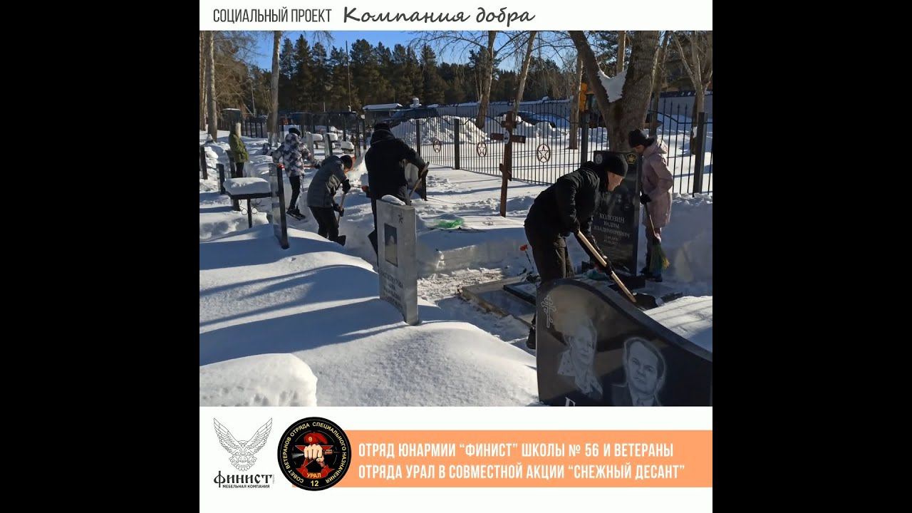 Компания добра. "Снежный десант". Уборка снега на мемориальном кладбище. Юнотряд Финист и Совет ветеранов 12 ОСН УРАЛ