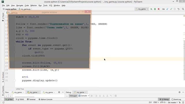 Курс на степике по Pygame https://stepik.org/z/118434 Степик с меня берет комиссию поэтому 1) Лучший способ приобрести курс - личный банковский перевод в РФ или покупку тарифа на boosty. Я добавлю вас вручную на курс по вашему ид. https://t.me/artem_egoroff 2) оплачивать напрямую на степике по реферальной ссылке https://stepik.org/z/118434 так с меня возьмут меньше комиссии В курсе вы получите доступ ко всем закрытым видео, к закрытому чату в телеграмме и к практическим задачам Доступ к курсу бессрочный Доступ к закрытым видео на один месяц вы можете получить, став спонсором канала https://www.youtube.com/channel/UCMcC_43zGHttf9bY-xJOTwA/join https://boosty.to/egoroff_channel https://www.patreon.com/artem_egorov Телеграмм канал моего проекта https://t.me/python_egoroff Группа в вк https://vk.com/python.study Курс по основам Python https://stepik.org/course/63085/ Курс по ООП на Python https://stepik.org/z/114354 Курс по Django https://stepik.org/z/114288