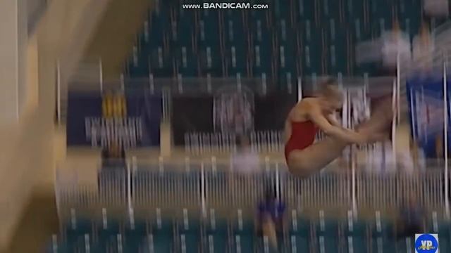 Купальщица подбегает к краю и прыгает с высоты в бассейн.