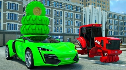 Трактор против спортивного автомобиля - Зеленый спортивный автомобиль украл колесо у красного тракто