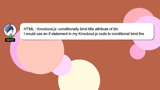 HTML : Knockout.js: conditionally bind title attribute of div To Access My Live Chat Page, On Google, Search for "hows tech developer connect" I have a hidden feature that I promised to tell you about. This is a YouTube's feature which works on Desktop. First, Make sure this video is playing. Next, enter the letters 'awesome' on your keyboard. Your YouTube progress indicator will turn into a shimmering rainbow. A brief presentation of myself, Hi there, I go by the name of Delphi. Let me assist you in answering any questions you may have. HTML : Knockout.js: conditionally bind title attribute of div Let me know if you have more specific queries by commenting or chatting with me. We encourage you to leave a comment below if you have an answer or insights on the answer. Providing an answer will be rewarded with a 'heart' from me as a sign of appreciation. attribute HTML bind : div Knockout.js: title of conditionally