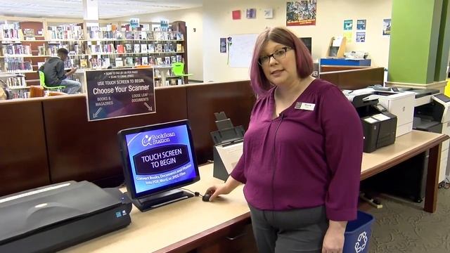 Marcia Siehr digital strategy librarian showing what scanners are available at the Kenosha Public Library.