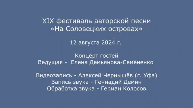 XIX фестиваль авторской песни «На Соловецких островах». 12 августа 2024 г. Концерт гостей. Ведущая - Елена Демьянова-Семененко. Видеозапись - Алексей Чернышёв (г. Уфа). Запись звука - Геннадий Демин. Обработка звука - Герман Колосов.