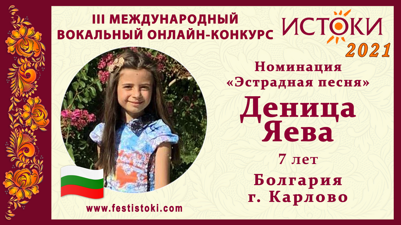 Лауреат III степени III Международного вокального онлайн-конкурса «Истоки». Номинация "Эстрадная песня". Народная песня "Воды". Сайт: www.festistoki.ru / www.festistoki.com E-mail: festistoki@mail.ru