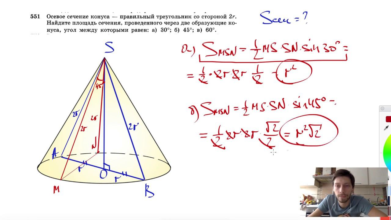 №551. Осевое сечение конуса — правильный треугольник со стороной 2г. Найдите площадь сечения, проведенного через две образующие конуса, угол между которыми равен: а) 30°; б) 45°; в) 60°. Поддержать канал рублём - 5469400944002125 (Сбербанк) Мой второй канал для подготовки к ЕГЭ и ОГЭ - https://www.youtube.com/ЕвгенийСумин Инстаграм - https://www.instagram.com/EGE_OGE.math Личный инстаграм - https://www.instagram.com/ee_sumin VK - https://vk.com/evgeniysumin FB - https://www.facebook.com/EvgeniySumin