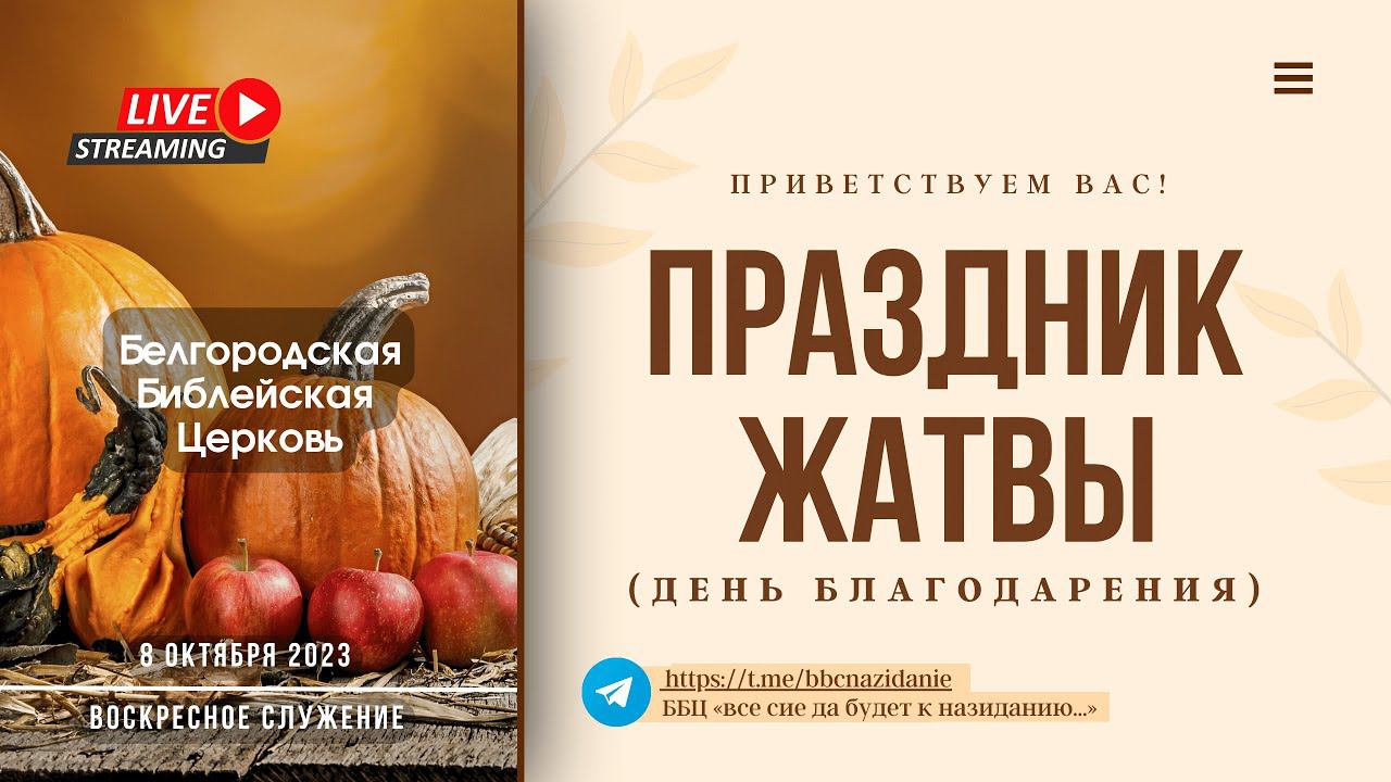 Рады приветствовать вас, дорогие гости канала! Мы являемся церковью Господней, проповедующей Евангелие, основанное на Библейском понимании. Приглашаем вас в нашу церковь, чтобы вместе прославлять Бога и возрастать в понимании Его истин, а также быть в общении в доброй атмосфере обитания Духа Божия. Сегодня будем приносить хвалу Отцу нашему небесному в день Жатвы. Этот праздник является очень глубоким по содержанию, имеющий определенную привязку к последнему времени. Тем не менее, библейский праздник Жатвы также указывает нам на то, что мы можем иметь надежду на лучшее (1-е Пет.1:1; 2:9, 10, 12). Одним из наиболее значимых символов праздника жатвы является _колосья зерна_. Они символизируют богатство, изобилие и урожай, а также обращают внимание на уникальность этого времени года, когда зерно собрано и готово к использованию. Колосья также напоминают нам о том, что плоды труда никогда не даются легким путем, так как требуют много усилий и терпения. Поблагодарим Бога за Его заботу и любовь, что мы имеем все необходимое и достаточное для нашей жизни (как физически, так и духовно), которым Он обеспечивает каждого человека. Наш адрес: г. Белгород, п. Дубовое, ул. Пригородная, 55. *Реквизиты: 5336 6903 5594 9290 (Вячеслав Владимирович Катречко) — пожертвование на нужды церкви.* *Контакты: ✆ +79623006932 (Viber, WhatsApp)* *Дмитрий Сукач* ✆ *+79202099995 (Viber)* *Александр Денисьев* ✆ *+79511422206 (Viber)* *Евгений Мясоедов* _Ссылка на наш телеграмм-канал: https://t.me/bbcnazidanie (ББЦ «все сие да будет к назиданию...»)_