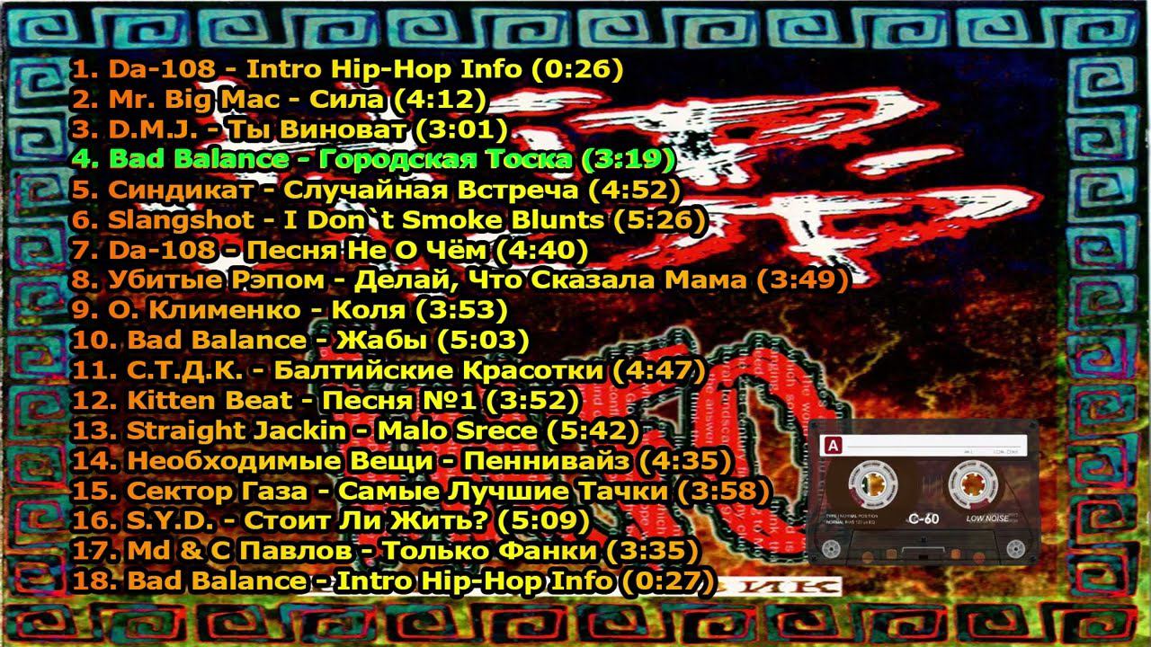 1. Da-108 - Intro Hip-Hop Info (0:26) 2. Mr. Big Mac - Сила (4:12) 3. D.M.J. - Ты Виноват (3:01) 4. Bad Balance - Городская Тоска (3:19) 5. Синдикат - Случайная Встреча (4:52) 6. Slangshot - I Don`t Smoke Blunts (5:26) 7. Da-108 - Песня Не О Чём (4:40) 8. Убитые Рэпом - Делай, Что Сказала Мама (3:49) 9. О. Клименко - Коля (3:53) 10. Bad Balance - Жабы (5:03) 11. С.Т.Д.К. - Балтийские Красотки (4:47) 12. Kitten Beat - Песня №1 (3:52) 13. Straight Jackin - Malo Srece (5:42) 14. Необходимые Вещи - Пеннивайз (4:35) 15. Сектор Газа - Самые Лучшие Тачки (3:58) 16. S.Y.D. - Стоит Ли Жить? (5:09) 17. Md & C Павлов - Только Фанки (3:35) 18. Bad Balance - Intro Hip-Hop Info (0:27) НЕ ЗАБЫВАЕМ ПОДПИСАТЬСЯ ▬▬▬▬▬▬▬▬▬▬▬▬▬▬▬▬▬▬▬▬▬▬▬▬▬▬▬▬▬▬▬▬▬▬▬▬▬ Ждем Вас в наших соц сетях ✅► Вступайте в группу в ВК https://vk.com/bendersru ✅► Вступайте в группу в OK https://ok.ru/bendersnt ✅► ЮТУБЕ https://www.youtube.com/c/MusicBoxNT ✅► ЯНДЕКС https://zen.yandex.ru/id/5f1d090d895a2e501e2c3efb ✅► РУТУБЕ https://rutube.ru/channel/13411124 ▬▬▬▬▬▬▬▬▬▬▬▬▬▬▬▬▬▬▬▬▬▬▬▬▬▬▬▬▬▬▬▬▬▬▬▬▬ ✅► на поддержку канала DonationAlerts ►10₽ https://www.donationalerts.com/r/prizrakntru ✅► также вы можете оставить голосовое сообщения 500₽ ✅► Яндекс ►10 ₽ https://donate.stream/ya410013343494279 ▬▬▬▬▬▬▬▬▬▬▬▬▬▬▬▬▬▬▬▬▬▬▬▬▬▬▬▬▬▬▬▬▬▬▬▬▬ ✅► Буду рад вашим лайкам и подписке