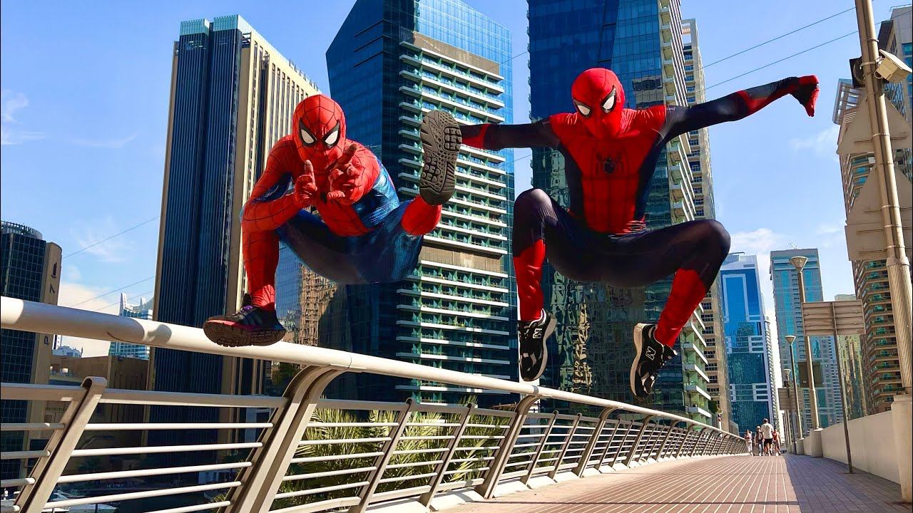Parkour two Spider-Man doing a somersault