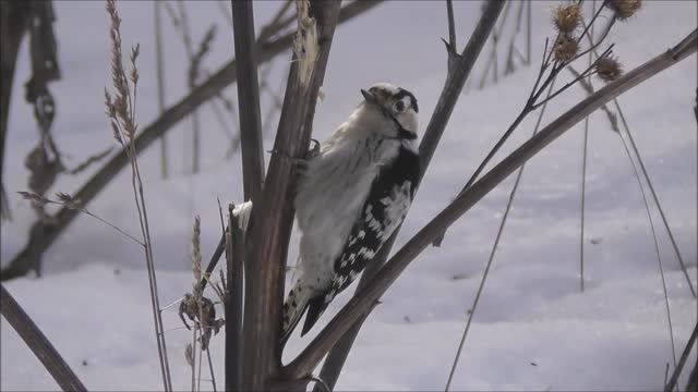 Малый Пёстрый Дятел, самка, долбит репейник, Наблюдение птиц в Великом Новгороде, 19 марта 2023