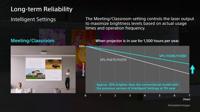 Intelligent Settings simplifies installation and maximizes performance with four available presets based on usage, image detail, color richness, color fidelity, light output, cooling level, and output noise. Presets include meeting room/classrooms, museums/displays, entertainment venues and multi-screen installations. The projectors also feature a sealed laser light source and dedicated cooling duct structure to prevent dust accumulation, and a hassle-free automatic filter cleaning system. Learn more - https://pro.sony/ue_US/products/laser-projectors/vpl-fhz85