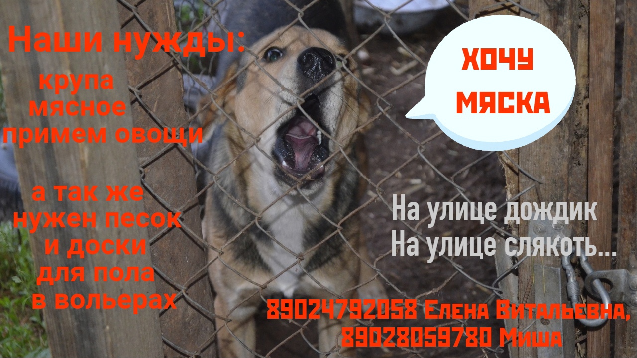 Что нам надо? Нам нужны ручки и домики! А пока их не нашли Хвостикам надо питание и комфорт чтобы дождаться Хозяев сытыми и здоровыми! Для этого, как минимум, нужна крупа и мясное чтобы была возможность варить кашу Хвостикам, а чтобы она была вкусная и питательная нужно мясное. В холода собакенов кормим дважды, дополнительно мясным, на которое улетают все наши средства ибо в день на него нужно минимум 500-600р.+ стоимость каши выходит около 1000р.в сутки! Еще не откажемся от овощей, которые добавляем в каши. Это и витаминчики и огромная экономия крупы! Идет осень, начались холода. Утеплиться мы по минимуму утеплились, но мы тонем в глине! У нас почва глинистая, которую надо засыпать песком! Другие варианты пробовали, но они не удобны или вообще невозможны! Так например собакам никто не позволит засыпать территорию строительным мусором... без вариантов. Нам нужен ПГС или очень мелкий гравий. А в вольерах лучше всего сделать пол из досок, но это еще дороже! Друзья, мы сами не можем справиться! Нам очень нужна Ваша помощь в поддержке питания Хвостов и в осушении их территории! Хвостики от излишней влаги могут простыть и заболеть! Но мы не можем этого допустить, поэтому очень просим помощи! Желающим помочь Хвостикам тлф 89024792058 Елена Витальевна, 89028059780 Миша, звонить желательно вечером или пишите смс.