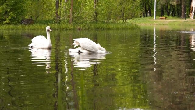 Две лебединые пары вернулись на Лебединку в парке.