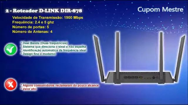 5 Melhores Roteadores Wireless Custo Benefício Compre com desconto especial das melhores lojas da internet aqui: https://cupommestre.com.br Ofertas e cupons de desconto atualizados diariamente! Muito mais economia em sua compras online, vem experimentar! Parceiro MAGALU: https://www.magazinevoce.com.br/magazinecupommestre/busca/roteador%20wireless/ #MelhoresRoteadoresWireless #RoteadoresWirelessCustoBenefício #CupomMestre #RoteadorWirelessIntelbrasRG1200 #RoteadorWirelessDLINKDIR878 #RoteadorWirelessSiriusRE016 #RoteadorWirelessTPLinkArcherC60 1 - Roteador Wireless Intelbras RG1200 Possui 4 antenas: Dual band (duas frequências) Instalação e gerenciamento das configurações por smartphone Função Controle Parental Design discreto Valor acessível Negativo: Ter grandes dimensões 2 - Roteador Wireless D-LINK DIR-878 Tem 4 antenas: Dual Banda (Duas frequências) Sistema que direciona o sinal e não espalha Identificação automática da frequência ideal Design fino e moderno Ponto negativo: Alguns consumidores reclamaram do pouco alcance e ter valor alto. 3 - Roteador Wireless Sirius RE016 Este modelo vem com 8 antenas: Maior quantidade de antenas Conexão direcionada e múltipla Reprodução de conteúdos 4k Alternação automática da frequência 7 anos de garantia O ponto fraco é ter um design chamativo devido as 8 antenas, e tem um valor alto. 4 - Roteador Wireless TP-Link Archer C60 Aqui é um modelo com 5 antenas: Tem valor acessível A configuração é fácil Tecnologia MIMO Possui duas faixas de frequência Tem 5 antenas Gerenciamento pelo celular Design fino Aqui o ponto fraco é que alguns consumidores reclamam do pouco alcance 5 - Roteador Wireless Rot Wifi Gamer Tenda Este aparelho tem 4 antenas: Específico para games Variação de frequência dual band Alto alcance Design moderno Tecnologia de economia de energia Gerenciamento por celular Também aqui alguns consumidores relatam pouco alcance