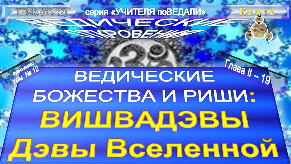 ВЕДИЧЕСКИЕ ОТКРОВЕНИЯ Э.К.Кришнамачарья (1926-1984)- Глава II. ВЕДИЧЕСКИЕ БОЖЕСТВА И РИШИ-ВИШВАДЭВЫ: Дэвы Вселенной(подразделы (п.п. 19)-сборник компиляций ведических писаний, составленный на основе различных трудов (записей, лекций) Учителя (мыслителя, целителя, общественного деятеля) уроженца Индии - Э.К. Кришнамачарья.