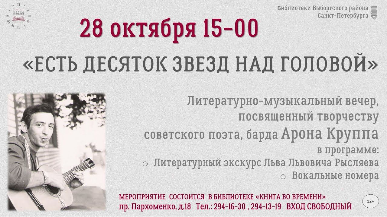 «Есть десяток звёзд над головой». Литературно-музыкальный вечер, посвящённый творчеству Арона Круппа. Ведущий - Лев Рысляев. 28 октября 2023 г. Санкт-Петербург, пр. Пархоменко, д. 18. Библиотека «Книга во времени». Видеозапись - Алла Левитан.