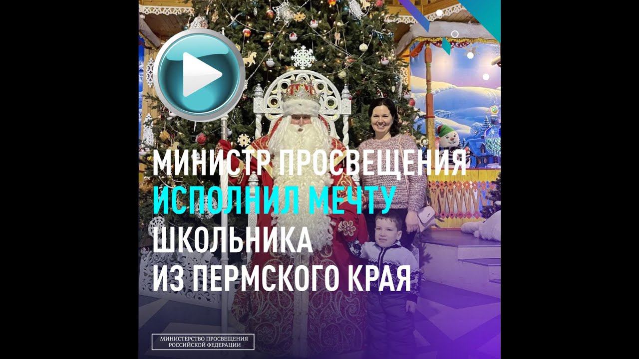 ✨ Новогоднее желание второклассника из Пермского края Никиты Останина исполнил министр просвещения Сергей Кравцов. В эти выходные мальчик вместе с мамой побывал в Вотчине Деда Мороза в Великом Устюге. Школьник прогулялся по тропе сказок, зимнему саду, посетил кузницу Деда Мороза, ледник с таинственными ледяными фигурами и зоопарк. Никита побывал в доме Деда Мороза, где оценил наряды главного волшебника страны и лично познакомился с хозяином Вотчины. Мальчик порадовал Деда Мороза стихотворением, загадал желание, а в ответ получил подарки и грамоту, подтверждающую то, что он побывал в сказке. Мечту мальчика помог осуществить министр просвещения Сергей Кравцов благодаря акции «Ёлка желаний», инициированной Президентом Владимиром Путиным. Смотрите, как это было. #ИнтересныйОпыт #ЕлкаЖеланий