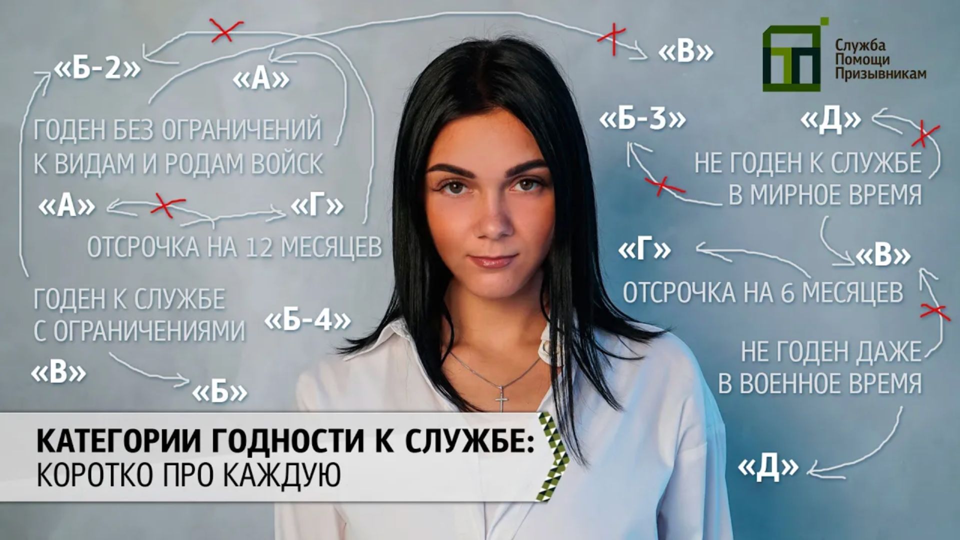 После проведения медицинского обследования определяется категория годности к военной службе призывника. Всего существует 5 категорий годности к службе: Категория годности «А» Категория годности «Б» (существует в 4-х модификациях) Категория годности «В» Категория годности «Г» Категория годности «Д» Что они означают и куда вас могут призвать с той или иной категорией годности? Об этом наше видео. Если вам понравилось видео "Категории годности к службе в армии: расшифровка ", ставьте лайки, подписывайтесь на наш канал. У нас есть целый плейлист, посвященный категориям годности, где можно посмотреть видео про каждую категорию в отдельности. Для тех, кто любит читать, наша статья — https://clck.ru/SCjwm Здесь вы можете узнать о Службе Помощи Призывникам еще больше: Сайт — https://clck.ru/SCjyb Вконтакте — https://vk.com/armyhelp Instagram — https://www.instagram.com/armyhelp_official/ Телефон нашей горячей линии для призывников 8(800)301-61-60 ☎ (по России звонок бесплатный)