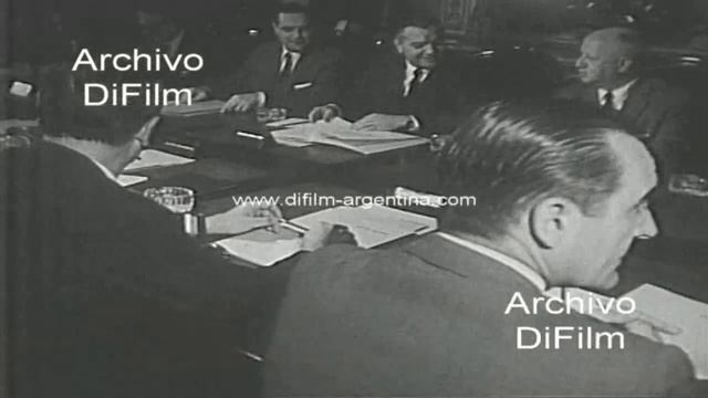 Bs. As.: El presidente de la nación, teniente general Juan Carlos Ongania mantiene una reunión en el salón de acuerdos de la Casa de Gobierno con el Gabinete Nacional y la junta de comandantes en jefe de las Fuerzas Armadas. Participaron los ministros del Interior, Enrique Martinez Paz; de Relaciones Exteriores y Culto, Nicanor Costa Mendez; de Economía, Jorge Nestor Salimei; los comandantes en jefe del Ejército, teniente general Pascual Pistarini; de Marina, almirante Benigno Varela; de aeronáutica, brigadier mayor Teodoro Alvarez; y los secretarios de Agricultura y Ganadería, Lorenzo Andres Raggio; de Hacienda, Francisco Aguilar; de Industria, Mario Galimberti; de Energía y Combustibles, Luis Gotelli; de Obras Públicas, Ernesto Guaia; de Comunicaciones, general Julio Teglia; de Transporte, Antonio Lanusse; los subsecretarios de Interior, Jose Maria Saravia; de Relaciones de Exteriores y Culto, Jorge Mazzinghi; de Economía, Evaristo Piñon Filgueira; de Educación, Carlos Maria Gelly y Obes; de Asistencia Social y Salud Publica, Ezequiel Holmberg; de Trabajo, Juan Tamborena; y de Seguridad Social, Francisco de Zan; el secretario general de la Presidencia, general Hector Repetto; el jefe de la Casa Militar, brigadier Rodolfo Pio Otero; el secretario de Informaciones del Estado, general Eduardo Señorans; el secretario de Prensa de la Presidencia, Hector Blas Gonzalez; y el presidente del Banco Central, Felipe Santino Tami (Sin sonido) Referencia: El jefe del Estado, teniente general Juan Carlos Ongania presidio hoy una nueva reunión del gabinete nacional para considerar los próximos pasos del gobierno revolucionario cumplidos dos meses de su gestión. (Fuente: Diario EL LITORAL de Santa Fe) Fecha: 30/8/1966 Duración: 33 segundos Código del film: A-09781 Copyright Archivo DiFilm - Buenos Aires - Argentina Consultas por material de archivo: difilm.info@gmail.com Visit our website: http://www.difilm-argentina.com Follow us on: https://twitter.com/archivodifilm