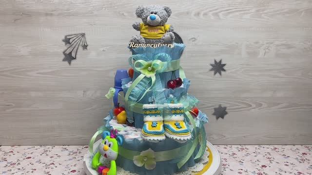 Торт из памперсов с мишкой и пинетками